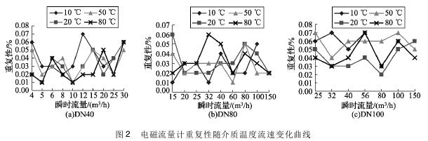 將實驗測得的耐腐蝕排污管道流量計在不同溫度及流速下的重復性數據整理,特性曲線如圖2所示,3組曲線分別對應DN40、DN80、DN100的3塊耐腐蝕排污管道流量計的重復性曲線。