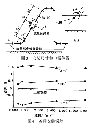 除儀表前直管段可降低彎管影響外,人們還從安裝方式上設(shè)法降低影響的方法。文獻曾報道電磁流量傳感器電極軸線與鄰近彎管平面成45°傾斜安裝可以減少彎管影響。日本工業(yè)標(biāo)準(zhǔn)B7554“解說部分”列有電極軸線與彎管平面垂直、平行、成45°三種安裝方式,在不同長度直管下的測量誤差范圍,也說明這一效果。