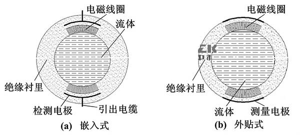 電極與被測流體通過絕緣管形成檢測電容,通過此電容來藕合流量信號。其主要的結構形式按照電極的安裝位置可以分為兩種:電極嵌人測量管的絕緣襯里內部(嵌人式)、電極貼在測量管外部(外貼式)。嵌入式結構與普通冷卻塔冷卻水流量計結構相似,而外貼式大多是通過陶瓷表面金屬化技術將電極貼在測量管外。