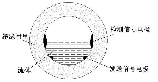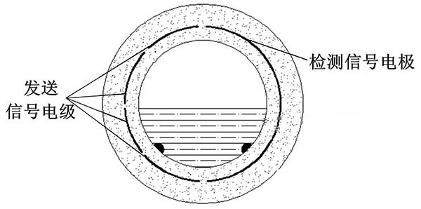③利用阻抗或信號衰減研制的非滿管冷卻塔冷卻水流量計。這種結構的非滿管冷卻塔冷卻水流量計是當前國內研究的方向之一。其結構是流量管底部貼一對信號發射電極,在流量管中間貼信號接收電極。由于信號在流體中傳播會產生衰減,且傳播時間越長,衰減越多,因此通過信號接收電極接收到的信號衰減量即可得知液面高度;同時該電極還能測量流體切割磁感線產生的電動勢,以此達到測量非滿管流量的目的。阻抗式或信號衰減非滿管冷卻塔冷卻水流量計結構簡圖如圖5所示。