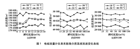 由圖1可得:( 1)隨著介質(zhì)溫度的升高,水處理流量計(jì)的儀表系數(shù)均呈逐漸降低的趨勢(shì)。其中20℃和50℃的儀表系數(shù)基本相同,10℃和80 0C的儀表系數(shù)與20℃時(shí)偏離較大。(2)溫度對(duì)水處理流量計(jì)的儀表系數(shù)在高溫以及低溫處影響明顯,以D N40水處理流量計(jì)為例,儀表系數(shù)本次實(shí)驗(yàn)高低溫處*大變化量約為0. 7% o ( 3)在水處理流量計(jì)相應(yīng)的流量范圍內(nèi),在同一溫度下,隨著介質(zhì)流速的變化,水處理流量計(jì)的儀表系數(shù)在個(gè)別點(diǎn)出現(xiàn)略微浮動(dòng),但整體變化不超過(guò)1 0. 2 %。