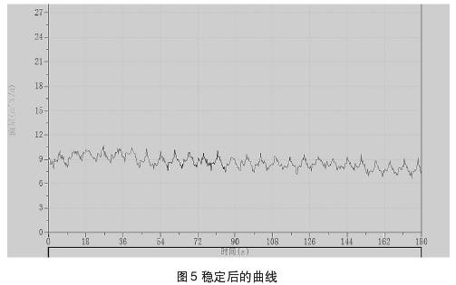圖4、圖5中所示曲線為測量過程中所截取的集流傘中所聚集的氣相,通過排氣通道排出時與排出后的測量曲線。測試過程中錄取到的儀器排氣的過程,當(dāng)集流傘完全支開后仍需要開啟流量測試進(jìn)行實時檢測,否則可能會錄取資料失真。