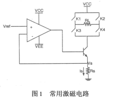 以往的激磁電路的設計都是采用恒流源和可控開關電路組成。恒流源是由電壓基準、比較放大、控制調整和采樣等部分組成的直流負反饋自動調節(jié)系統(tǒng),常用的激磁電路就是用串聯(lián)調整型恒流電源盒控制開關組成的,如圖1。其中Vref是參考電壓,Rs是采樣電阻,Is為流過Rs的電流,就是所需的恒流,RL為電磁流量傳感器線圈,K1、K2、K3、K4為可控開關,以達到使線圈RL中流經(jīng)正負交換的電流,對傳感器激磁。
