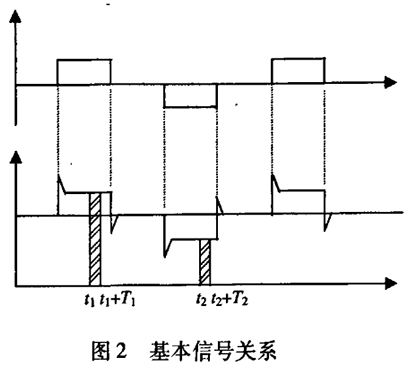 冷凍水計量表一般都采用工頻交流電源供電,其電源電壓的幅值和頻率的變化都會給冷凍水計量表帶來電源性干擾噪聲。對電源電壓的幅值變化,因采用多級集成穩(wěn)壓,一般而言電源電壓的幅值變化對電磁流量的測量精度影響不大。當電源電壓的頻率波動時,雖然其波動范圍有限,但對冷凍水計量表測量精度影響較大。為了解決工頻干擾問題,實現(xiàn)對流體流速感應(yīng)電勢e柚信號的準確測量,需利用以下基本關(guān)系:①勵磁周期為工頻周期的整數(shù)倍,即勵磁頻率為50/nHz(n為偶數(shù));②正負勵磁下的同相位采樣。圖2是對應(yīng)低頻矩形波勵磁形式下的典型電勢信號形式,按上述關(guān)系在一個勵磁周期下,若假設(shè)t。和t:點為工頻干擾的等效干擾點,且采樣寬度T=T1=T2,則e –ab的基本算式為:,