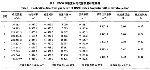 分別用精度0.5級(jí)音速噴嘴氣體標(biāo)定裝置、精度0.2級(jí)稱重法水標(biāo)定裝置對(duì)DN50口徑的不斷流渦街進(jìn)行實(shí)際標(biāo)定,其標(biāo)定數(shù)據(jù)如表1、表2所示。