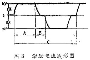 (1)激勵(lì)電流的波形檢查。在激勵(lì)電流檢查端EX+和EX一之間連接一個(gè)電阻(IΩ士0.1%),這個(gè)電阻與激勵(lì)線圈串聯(lián),示波器輸入端并聯(lián)在電阻上。若波形起伏很大時(shí),則不正常。波形正,負(fù)方向?qū)ΨQ(chēng),A一C測(cè)量周期值在規(guī)定的范圍內(nèi)則為正常,其波形如圖3所示。