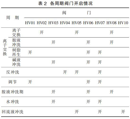 5)回流沖洗周期。 胺液每天都需取樣化驗(yàn),如果發(fā)現(xiàn)胺液中有不溶或懸浮的過渡金屬聚集,則每天運(yùn)行周期結(jié)束后需利用回流液對樹脂進(jìn)行清洗,以防止腐蝕和樹脂損壞。 如果選擇了此選項(xiàng),PLC程序會在每天完成目標(biāo)數(shù)量的離子交換周期后,自動(dòng)執(zhí)行回流液清洗周期。 各周期閥門對應(yīng)開關(guān)情況,如表 2 所示。