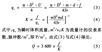 式中:m為漩渦發(fā)生體兩側(cè)弓形面積與管道橫截面面積之比;D為表體通徑,~;d為漩渦發(fā)生體迎面寬度,~;f為漩渦的發(fā)生頻率,Hz;U:為漩渦發(fā)生體兩側(cè)平均流速,耐s;sr為斯特勞哈爾數(shù);U為被測(cè)介質(zhì)來(lái)流的平均速度,耐s。管道內(nèi)體積流量q。為: