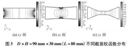 4) 圖 3( c) 、圖 4( c) 的 yz 面權(quán)函數(shù)分布表明,D = 90 mm時(shí)的權(quán)函數(shù)等勢線間距略大于 D = 60 mm 時(shí)的權(quán)函數(shù)等勢線間距,權(quán)函數(shù)變化梯度較小,且中心區(qū)域的權(quán)函數(shù)等勢線逐漸變?yōu)橹本€,因此 D = 90 mm 的權(quán)函數(shù)分布更均勻一些,但是兩者區(qū)別很小,即寬度改變對 yz 面權(quán)函數(shù)分布影響很小。圖 4( c) 、圖 5( c) 的 yz 面權(quán)函數(shù)分布表明,H = 30 mm時(shí)的權(quán)函數(shù)等勢線間距較大,且中心區(qū)域的權(quán)函數(shù)等勢線逐漸變?yōu)橹本€,因此 H = 30 mm 的權(quán)函數(shù)分布更加均勻;