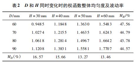 分別對上述結(jié)構(gòu)進(jìn)行有限元分析,根據(jù)式( 10) 計(jì)算 xy平面內(nèi)權(quán)函數(shù)整體均勻度 R,根據(jù)式( 11) 計(jì)算權(quán)函數(shù)隨 H變化的波動率 MH,隨 D 變化的波動率 MD,結(jié)果如表 2 所 示。