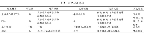 防腐型電磁流量計要根據被測流體的溫度、壓力、速度以及含固顆粒的硬度、含量和粒徑大小來決定測量管內襯的材質。該濕法磷酸裝置中,防腐型電磁流量計測量管襯里材質的種類見表 2。