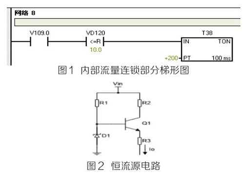 (2)PLC及模塊。PLC及模塊是自動化控制系統(tǒng)主要設(shè)備,且PLC及模塊屬于高集成高精密電子設(shè)備,保持室內(nèi)整潔舒適,可以提高自動化系統(tǒng)運(yùn)行穩(wěn)定性。PLC及模塊硬件運(yùn)行可靠,內(nèi)部控制程序是其控制核心軟件,如PLC硬件出現(xiàn)故障或損壞一般直接更換,但原內(nèi)部控制軟件無法上傳,整個控制系統(tǒng)成失控狀態(tài)。所以其內(nèi)部控制程序在調(diào)試驗(yàn)收合格后應(yīng)及時備份并做好標(biāo)記,為以后修復(fù)PLC故障提供保障。PLC系統(tǒng)的維護(hù)技術(shù)人員需掌握一定基礎(chǔ)PLC控制邏輯原理,對準(zhǔn)確判斷PLC故障點(diǎn)有很大的幫助。例如選礦廠水泵房S7-200系列PLC自動抽水系統(tǒng)出現(xiàn)如下故障 :觸摸屏能控制變頻器啟動水泵抽水,但在短時間內(nèi)會自動停泵,導(dǎo)致無法正常抽水。通過故障現(xiàn)象可初步判斷PLC及模塊硬件設(shè)備正常,主要由于某個變量有問題導(dǎo)致連鎖停機(jī)。打開備份PLC控制梯形圖程序進(jìn)行相關(guān)分析,原來是高溫液體流量計(jì)瞬時流量數(shù)值做了連鎖,其在一定時間內(nèi)瞬時流量不大于10m 3 /h時,自動停泵,電磁流量模擬量輸出電流值僅為4ma且無變化,確定高溫液體流量計(jì)有故障??膳R時應(yīng)急維修,模擬量模塊輸入模擬電流值10ma~20ma之間一固定數(shù)值即可恢復(fù)正常運(yùn)行。制作簡單恒流源電路代替高溫液體流量計(jì)輸出的模擬電流量,實(shí)現(xiàn)解決水泵無法正常運(yùn)行的故障。