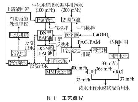 2種廢水在中間水池混勻后,通過泵提升進入保安過濾器,進一步去除細小的懸浮物后經過增壓泵進入超濾膜(UF)處理系統和反滲透(RO)系統,然后通過液體電磁流量計進行計量。反滲透出水直接進入回用水池達標回用,超濾濃水以及反滲透濃水用作水煤漿混合用水。污泥池中的污泥通過泵打入帶式機壓濾處理,濾液自流進入1#調節池。工藝流程見圖1。
