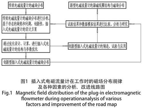 煤層注水流量計因其特殊的結構形式,致使其抗干擾能力較弱、準確度偏低以及瞬時流量波動過大等不良現象,但便于安裝、造價低廉、普遍應用于大管道等特點而存在。為了發揮其優勢,消除其不利因素,對其內部結構及其相關技術參數進行優化設計,從而使其準確度能夠達到 ±1% FS,使抗干擾能力得到極大地增強。本文主要通過優化設計、選擇材料和試驗,使煤層注水流量計的穩定性和準確度大幅度提高,并提出解決措施,對實際應用具有參考價值。分析與研究程序圖如圖 1 所示。