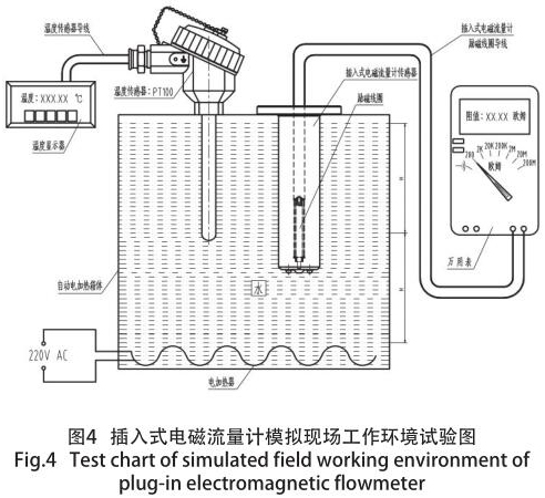 其原因是:勵磁線圈的阻值及匝數是按照常溫狀態下進行設計的,而含有勵磁線圈的煤層注水流量計經常是高于常溫狀態下進行安裝、使用(如:高爐回水、供熱管道等),勵磁線圈的阻值隨使用環境溫度的變化而變化,致使煤層注水流量計測量時的準確度大為降低,性能的不確定性大為增加,為了保證儀表的高準確度和穩定性,在不同的季節(主要是環境溫度和介質溫度),經過大量模擬現場實際情況的試驗,并結合轉換器的技術參數要求,得出一個完善的勵磁線圈各種技術參數。模擬現場試驗裝置如圖 4 所示。