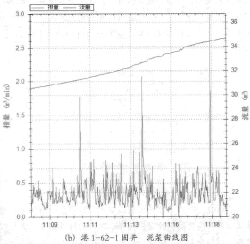 在固井全程的曲線中,也可以發(fā)現(xiàn)開始固井的時候.泥漿排量雜波較小,究其原因是剛開始固并時,泥漿管線剛泄壓,管線中還是充滿了液體,雖然振動強度雷同.但是葉片有阻尼,振幅較小.對其影響也較小。例如曲線圖的11;03: 00-11: 03: 53之間的泥漿排量沒有雜波。在港1-62-1固井過程中,水泥漿打了413澎,結(jié)果本應該是0的泥漿,卻走數(shù)了23.0 m',其影響可謂巨大.并非通過普通的濾波或切除所能排除,必須執(zhí)行一個特殊算法。