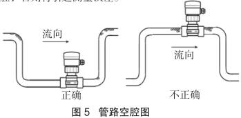 測量流向取決于航空煤油流量計(jì)的安裝方位,將航空煤油流量計(jì)在接頭上旋轉(zhuǎn) 180 度即可反向。正流向時(shí),航空煤油流量計(jì)的突耳應(yīng)在上游方向。流量顯示總是正的,而累加器可以根據(jù)流向增加或者減少。安裝中確認(rèn)管路設(shè)計(jì)不允許在介質(zhì)中產(chǎn)生氣泡或空腔,否則將引起測量誤差(見圖 5)。
