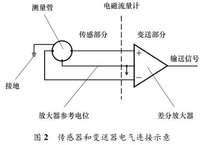 液體流量計主要由兩部分組成:流量傳感器和信號變送器,如圖 2 所示。傳感器上的勵磁線圈接受變送器傳輸來的勵磁電流產生磁場,輸出感應電動勢信號;信號變送器則將感應電動勢信號轉換為流量信號或模擬量信號送至控制系統。液體流量計按組成方式分為一體式和分體式。液體流量計穩定工作另外一個重要條件是接地。當流體流動穿過磁場時,以導電流體本身作為參考電位,在測量管一側電極產生正電勢,另一側產生負電勢,形成電勢差。但此電動勢信號一般只有幾毫伏,易受外界干擾。為防止干擾,將參考電位接入大地作為零電位,保證傳感器輸出精確穩定的信號。傳感器和轉換器的接地端必須與被測介質同電位,才能構成對稱的輸入輸出回路。