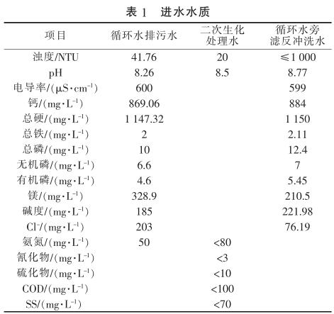 由表1可知,循環水排污水濁度較高,硬度大,主要是鈣鹽、鎂鹽含量較高;二次生化處理水是經現有的生化處理系統處理后的氣化灰水、沖渣水等廢水,其氨氮、COD需進一步去除,以利于后續脫鹽處理系統的運行。
