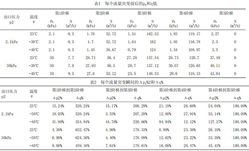 為了深入研究溫度及流量突變對分體式電磁流量計(jì)響應(yīng)速度的影響趨勢,把每個流量突變點(diǎn)前后的出口壓力p2,流量q列表如表1所示。