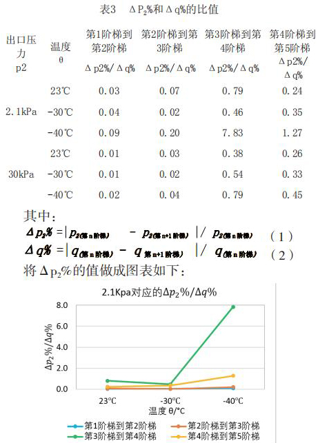 為了更直觀嚴(yán)謹(jǐn)?shù)膶Ρ让總€階段響應(yīng)速度的不同,對原始數(shù)據(jù)進(jìn)行處理,得到如下表格2和表格3。將△p2%/△q%作為響應(yīng)速度的直觀量化表達(dá),若△p2%/△q%的值大,說明單位流量變化照成的出口壓力變化大,即說明分體式電磁流量計(jì)響應(yīng)相對較慢,反之亦然。