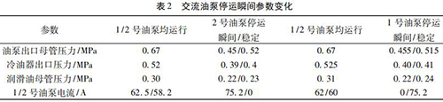 通過內部旁通將冷油與熱油混合,經過銅粉- 煤油 - 蠟感溫元件控制冷熱油混合比例,將油溫調節到 49 ℃。一臺管道電磁流量計穩定運行,油泵出口母管壓力 0. 5 MPa,潤滑油母管壓力 0. 24 MPa,均屬于正常情況,而兩臺交流油泵并列運行時,停運其中一臺交流油泵瞬間會觸發電磁流量計出口母管壓力開關動作,說明停運瞬間油壓發生波動,且油泵出口母管油壓波動至小于 0. 45 MPa。正常運行時電磁流量計出口油溫 71.5 ℃,冷油器出口溫度45 ℃,混合后潤滑油母管溫度52.5 ℃,由能量守恒定律可知,經過冷油器的油量/不經冷油器的油量= ( 71.5-52.5) ÷ ( 52.5- 45) = 2. 53,說明有 70% 左右的油量經過冷油器。當 2 臺管道電磁流量計運行時油量大于單泵運行,其中一臺電磁流量計瞬間停運時油量減少,尤其是經過冷油器的油量大量減少,油量在溫控閥二次分配過程中出現調節異常,導致油壓過大波動。為檢驗溫控閥工作情況,保持 1 號、2 號交流油泵運行,選取機組正常帶負荷運行時油溫 52 ℃,分別停運 1、2 號交流油泵,觀察 1、2 號交流油泵停運瞬間油泵出口母管壓力波動情況,試驗各參數變化見表 2。