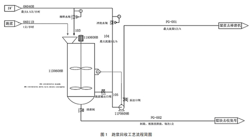 通過以上煤漿提濃通用方法優缺點比較可以了解到,在現有設計條件基礎上,煤漿濃度提升會帶來一定設備損耗及能源損耗。針對這種情況,為了達到節能而保證管道蒸汽流量計不跑漿,對于磨機跑漿問題進行改善,對跑漿進行回收,重新送回磨煤機進行二次研磨,降低了管道蒸汽流量計入口原料煤的粒度;同時降低了人員勞動強度,改善了現場衛生情況。具體跑漿回收裝置設計流程如圖 1 所示。