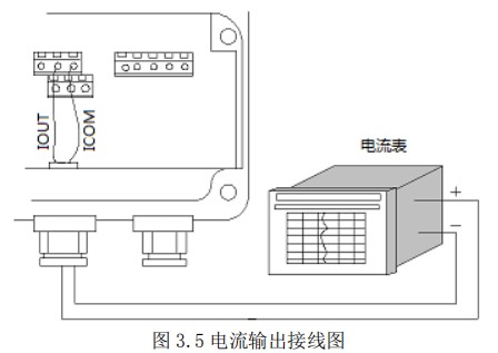 使用電流輸出線(4-20mA)時,應(yīng)注意到導線的電阻與負載電阻之和不得大于 750Ω 。電流輸出接線見圖 3.5。