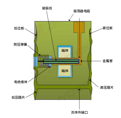 由磁場驅(qū)動的振蕩器電路會導致導線以其共振頻率振蕩。導線的一側(cè)牢固地固定到靜態(tài)部件,而另一側(cè)則連接到膜片。彈簧使電線預緊。由于過程壓力對隔膜的影響,金屬絲將在壓力升高時拉伸,而在壓力降低時收縮。共振頻率將相應(yīng)地增加或減少。數(shù)字計數(shù)器測量諧振頻率的變化,并將其信號傳遞給微芯片,該微芯片還處理線性化補償和溫度補償。
