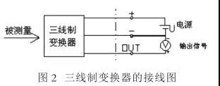 三線(xiàn)制變換器的接線(xiàn)圖如圖 2 所示,電流輸出系統(tǒng)除了兩根電流傳輸線(xiàn)以外,還有一根電源線(xiàn)向變壓器提供電源。三線(xiàn)制就是電源正端用一根線(xiàn),信號(hào)輸出正端用一根線(xiàn),電源負(fù)端和信號(hào)負(fù)端共用一根線(xiàn)。其供電大多為 DC 24V , 輸出信號(hào)有 DC4-20mA ,負(fù)載電阻為 250Ω 或者 DC0-10mA ,負(fù)載電阻為 0-1.5kΩ ;有的還有 mA 和 mV 信號(hào),但負(fù)載電阻或輸入電阻,因輸出電路形式不同而數(shù)值有所不同。