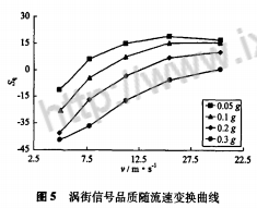 圖5給出了不同管道振動(dòng)加速度下渦街信號(hào)品質(zhì)隨流速變化的情況。不論振動(dòng)加速度如何變換,Sq的變化趨勢(shì)都是隨著流速的增加而變大,但Sq何時(shí)由負(fù)變正,則與振動(dòng)加速度密切相關(guān)。相同流速下,管道振動(dòng)加速度越大,Sq值越小,渦街信號(hào)品質(zhì)越差。Sq小于零時(shí),表明由振動(dòng)引起的其他頻帶能量大于渦街頻帶能量,且Sq絕對(duì)值越大,渦街信號(hào)品質(zhì)越差,渦街流量計(jì)的測(cè)量誤差越大;Sq大于零時(shí),表明渦街頻率帶的能量大于其它頻帶的能量,管道振動(dòng)對(duì)渦街信號(hào)影響較小,且Sq值越大,渦街信號(hào)品質(zhì)越好,渦街流量計(jì)的測(cè)量誤差越小。這也與圖3(a)得到的試驗(yàn)結(jié)果完全吻合。