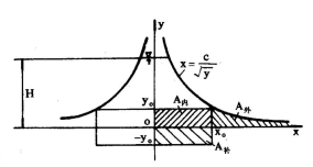即縱坐標(biāo)y值趨近于零時(shí),橫坐標(biāo)x值趨近無(wú)窮大。這在堰板的實(shí)際制作上是無(wú)法實(shí)現(xiàn)的。若將堰口曲線的*低縱坐標(biāo)取為yo,在yo一下至(-yo)增開一矩形,即高為2yo,寬為2x。的補(bǔ)償孔,從數(shù)學(xué)上可以證明,坐標(biāo)原點(diǎn)以下所增大的矩形面積(A補(bǔ))正好等于舍去的曲邊面積(A補(bǔ))。由圖3可知