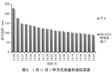 見(jiàn)圖3,以手工實(shí)測(cè)液位高度為基準(zhǔn),2種流量計(jì)的誤差均在±5%的范圍內(nèi)。除在1月9日14:40和14:45兩個(gè)時(shí)間點(diǎn)測(cè)量值表現(xiàn)出DR-831A測(cè)量誤差高于TKL-Ⅰ外,其他時(shí)段都明顯表現(xiàn)出DR-831A測(cè)量誤差小于TKL-Ⅰ。
